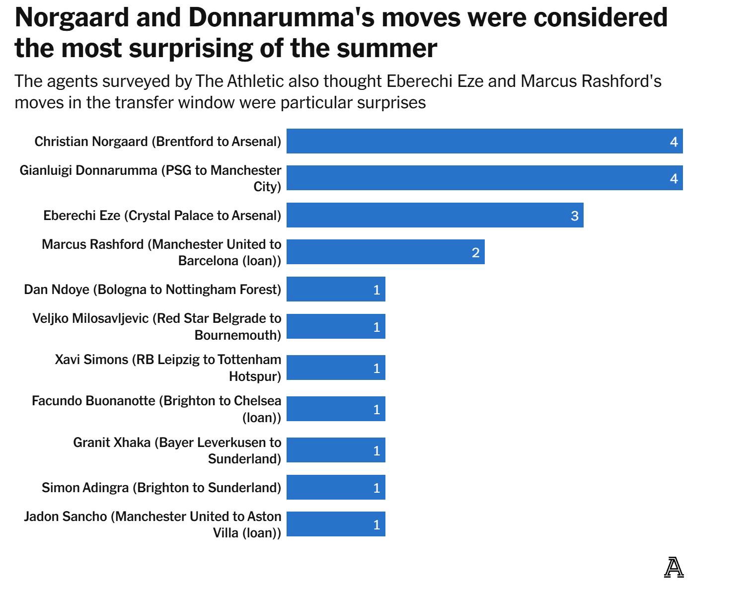 其他“令人惊讶”的交易包括西蒙斯从莱比锡加盟热刺(“像其他人一样,我整个夏天都以为他会去切尔西”),以及前阿森纳队长扎卡从勒沃库森转会桑德兰:“对于一支新升级的俱乐部来说,签下一名了解顶级俱乐部运作的精英级球员,并说服他搬到英格兰东北部,真是一个惊喜——而且他们捡了个大便宜。”